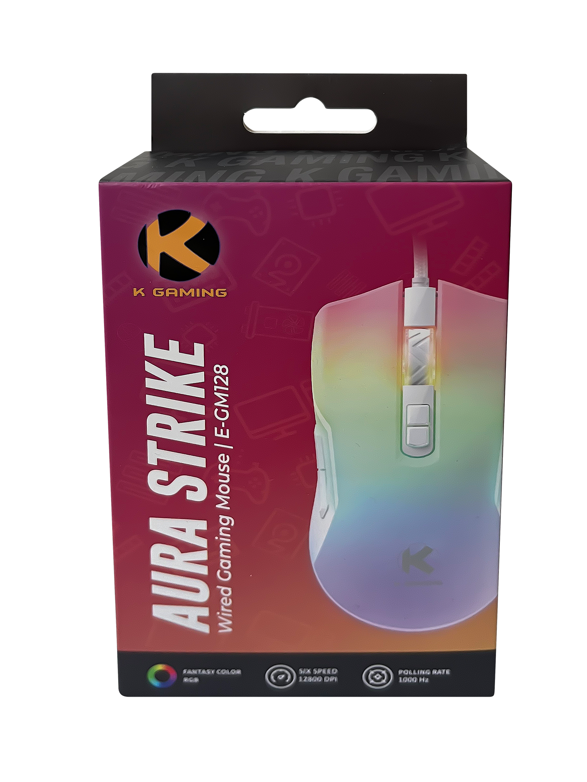 The K-Gaming Aura Strike E-GM128 Wired Gaming Mouse is designed for precision and durability. Featuring 7 customizable buttons, RGB lighting, and DPI settings up to 12,800, it’s built for high-performance gaming. With a 1000Hz polling rate, 10 million click lifespan, and a 1.5m braided cable with a magnetic ring, it offers smooth, responsive control. Compact yet comfortable at 125x64.5x39mm, the Aura Strike is the ultimate gaming companion. Upgrade your gear today!